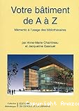 Votre bâtiment de A à Z : mémento à l'usage des bibliothécaires [texte imprimé] / Anne-Marie Chaintreau, Collaborateur ; Jacqueline Gascuel, Collaborateur . - Paris (Rue Grégoire de Tours, 35, 75006, France) : Editions du Cercle de la librairie, 2000 . - 314 p. : ill., fig. ; 24 cm. - (Bibliothèques) . ISBN : 978-2-7654-0778-2 Annexes: sigles et acronymes, adresses utiles, bibliogr., index des matières, index des auteurs des citations Langues : Français (fre)